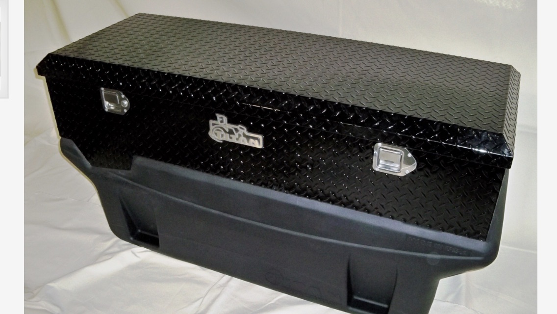 Black finished aluminum, 6.8 cu. ft. (total) capacity, tool box bolts to the top of any of the above TITAN 60 gallon In-Bed Fuel Tank models to form a fuel tank/toolbox combination. Constructed of heavy-gauge aluminum diamond plate, it features plated and black finished locks for security and an air spring supported lid for convenience.; Box has two compartments; one for tools and one which completely houses the fill neck, fuel gauge and the in9901130 Transfer Pump Kit when installed. Fill neck extension included for easy filling. Box protects fuel, tank components, and tools from theft and the weather. Holds up to 100 lbs. of tools. Dimensions: 56.00in x 21.00in x 12.00in high.
